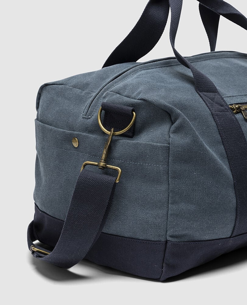 The Foxton Duffle is a larger size washed cotton canvas bag that is perfect for travel, gym or a carry all. The base is made from a heavy weight canvas for durability. The Foxton features two end press stud pockets, a side zip pocket, and an internal pouch pocket for devices. It has 2 sturdy handles and an adjustable, removeable shoulder strap.